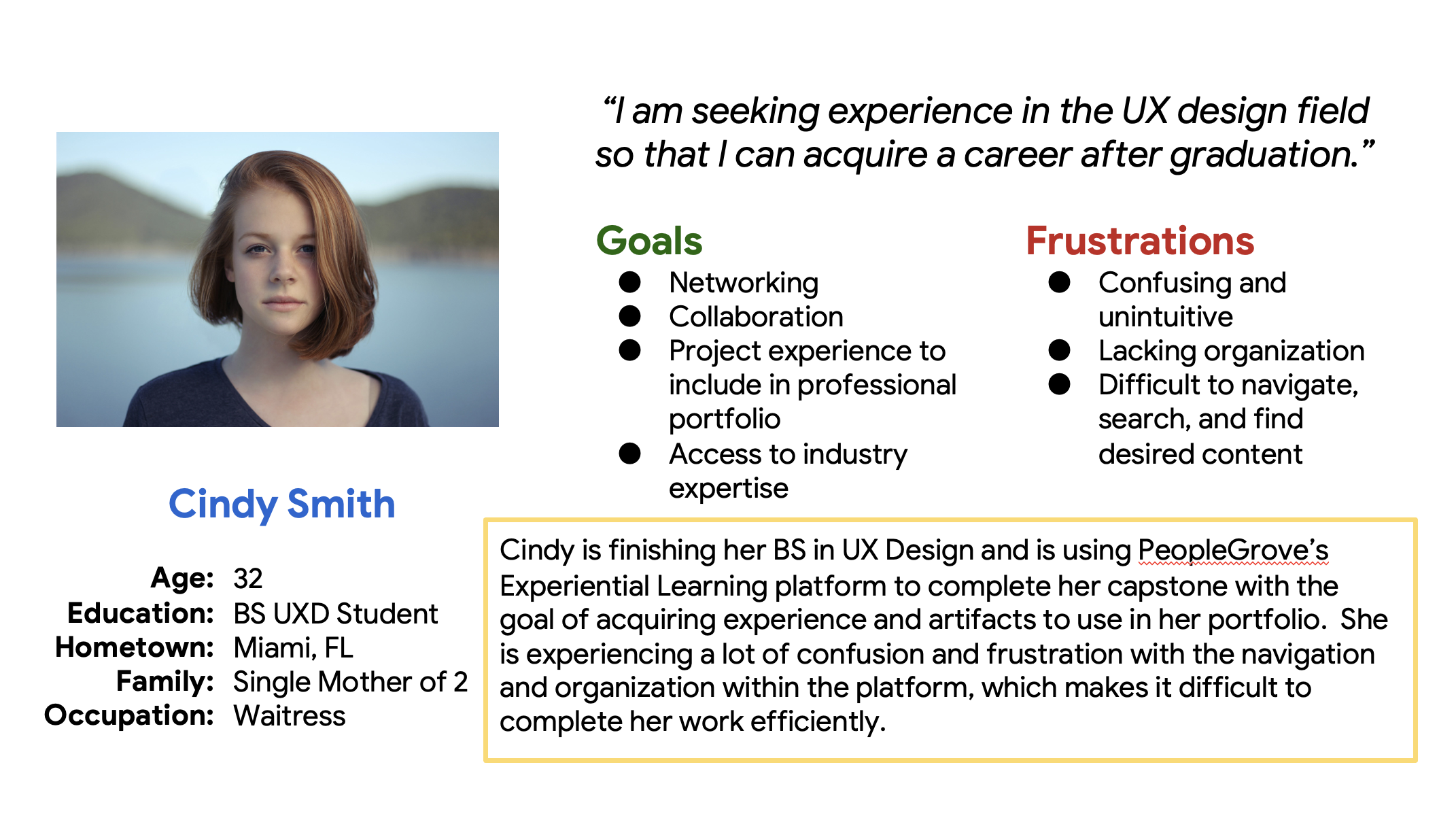 My target audience included students enrolled in the capstone project course to receive their Bachelor of Science degree in either Communications or UX Design at WGU. The students came to the PG platform for the sole purpose of completing their capstone projects, with the hopes of gaining experience and potentially developing portfolio artifacts. Students frequently became frustrated with the confusing and unintuitive nature of the navigation interface. They found it difficult to find and access the material and resources needed to manage and complete their projects.