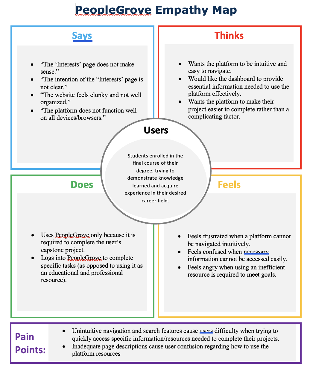 The empathy map I developed from the research revealed many things about the users. One student said, “The platform feels clunky and not well organized.” Multiple students expressed the desire to see the platform be more intuitive and easier to navigate. They felt the dashboard needed more information for the user to understand the platform’s purpose and how to use its functions optimally. Some students felt confused when they couldn’t access necessary information easily, and were frustrated that the requirement to use the PG platform to complete their capstone project was slowing them down. The PG platform could be seen as a barrier to efficient degree completion by some students.