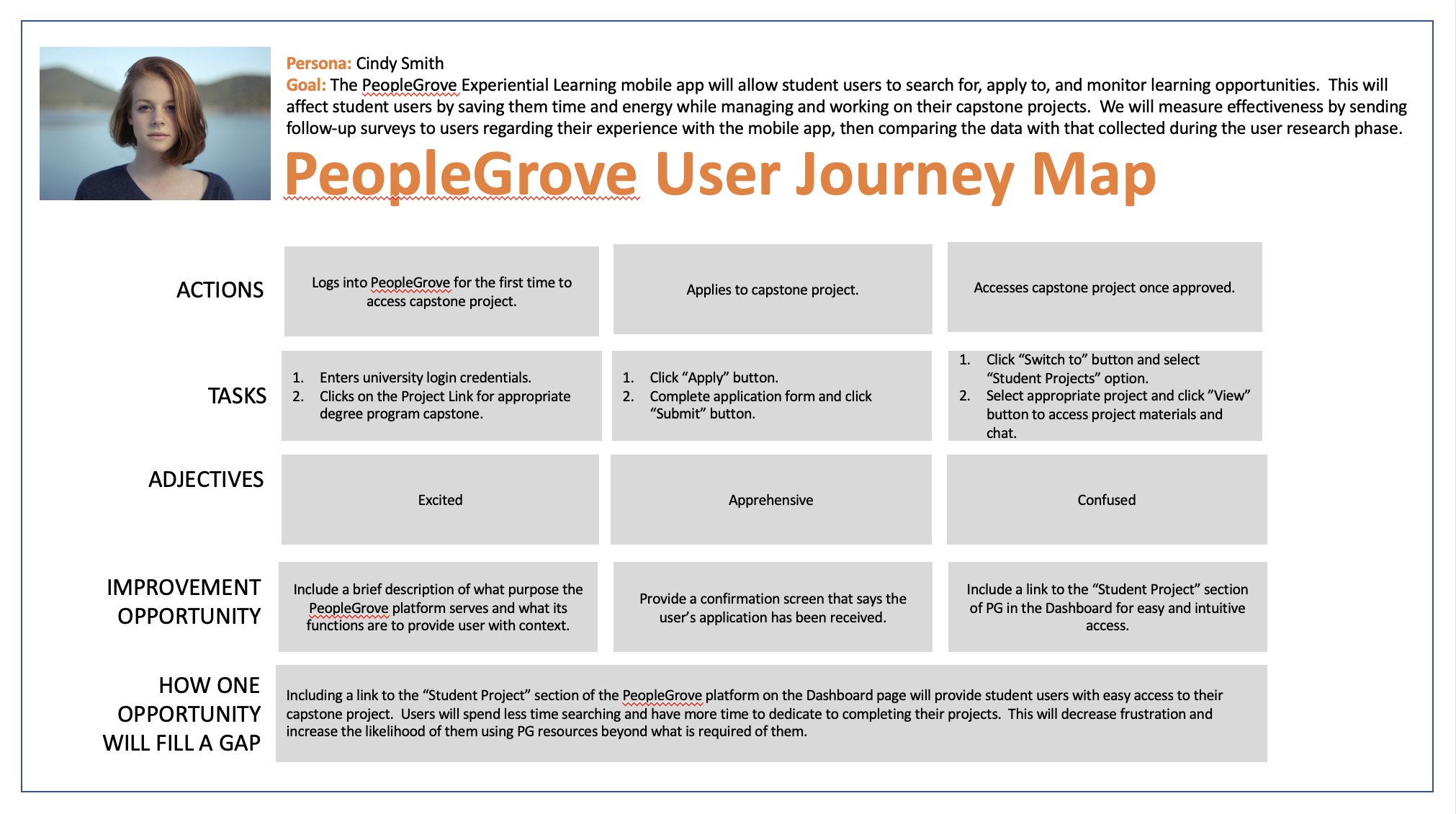 I created the user journey map to help me identify exactly where the user pain points were so that I could design a more user-friendly mobile platform. The user journey map took the user persona through the steps of their first interaction with the PG dashboard, applying for their capstone project, and then accessing their project from the dashboard once it is approved. One pain point occurs when the user first opens the PG platform. The purpose of the platform is not easily identified, and it is difficult to know what action should be taken. Another pain point occurs once the user’s project application is approved. There is no clear indication of how the user can access their approved/current projects on the dashboard. These user pain points helped me understand where the PG platform could be improved in the design of the mobile app.